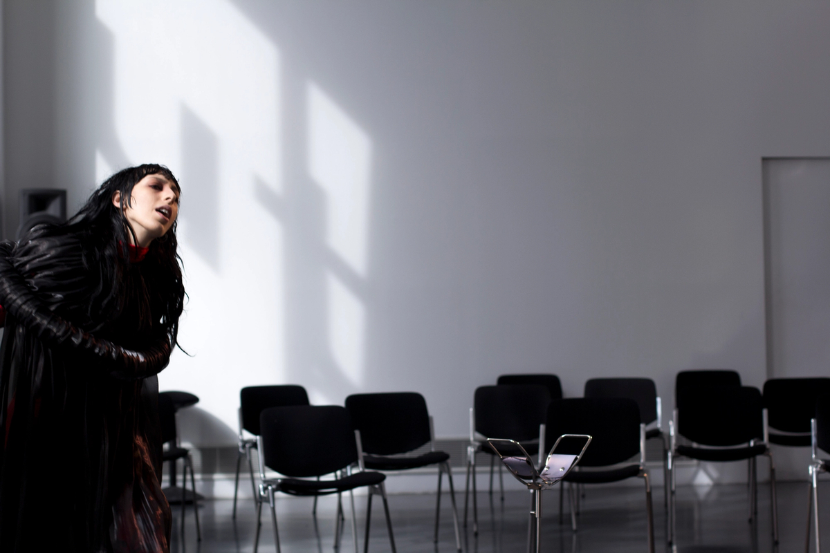 Mouthless Part II (Dziady) is a live performance that departs from the logic of the out-loud reading format, used in Mouthless Part I, to embrace theatrical, musical, and ritualistic modes of staging. In this work, the space accommodates several sculptural works, LED screens and three actors who assemble to evoke the Eastern European folk tradition of Dziady —the Slavic Day of the Dead. This performative summoning of familial spirits is furthered through the use of GAN animations and LED fans, clashing the ritualistic aesthetic of folklore with that of contemporary technology. Lip-synching to a pre-recorded soundtrack, the performers move in an eerie choreography while interpreting a musical composition based on the melodies of Lithuanian folk songs Sutartinės. The sinister feel of polyphonic singing, heavily repetitive and melodically dissonant, produces an overwhelming sense of displacement and is exaggerated further when the track is suddenly reversed eroding legible language and leaving behind only weird tonal debris. Past, present, future, bleed into one another as fragments and circulate, through bodies and technical interfaces.Malevolent spirits inhabiting Eastern European serve to demonstrate that the past was never actually ‘past’ at all. The dead, drowned, burned and buried live—they have always lived—in the spill, in the landscape and in folk horror. It is no coincidence, thus, that the choreography of the piece refers to the cyclical time, characteristic of the folk horror genre, the pagan religions, the myths and folklore.