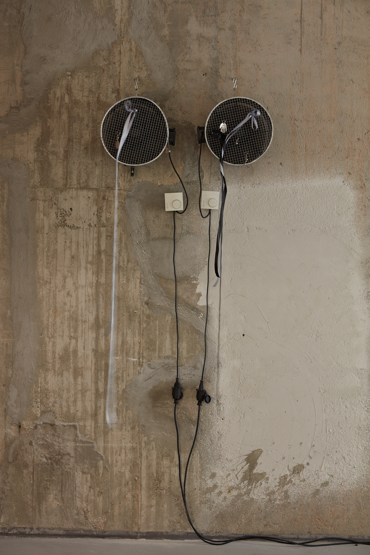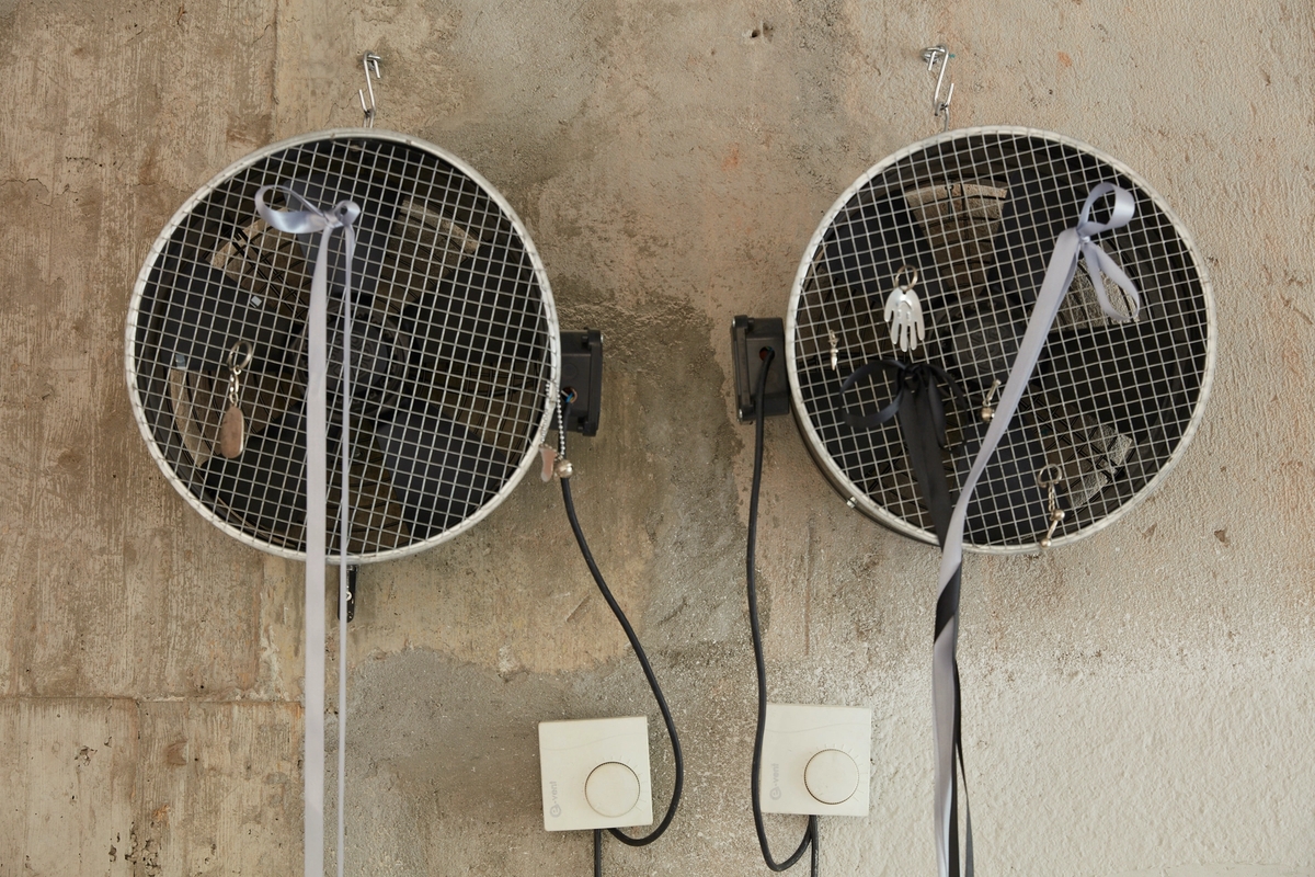 Powder-coated steel industrialfan with protective aluminium grill, aluminum and steel charms, ribbons 35x35x26cm each