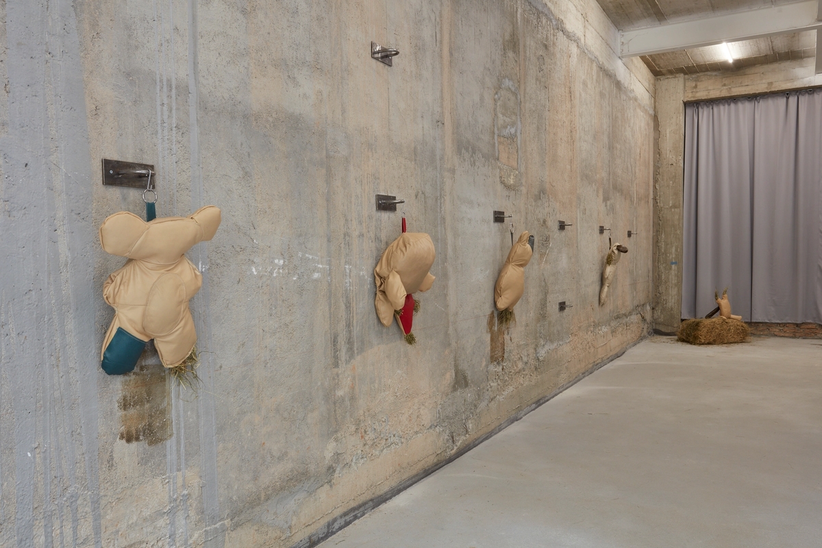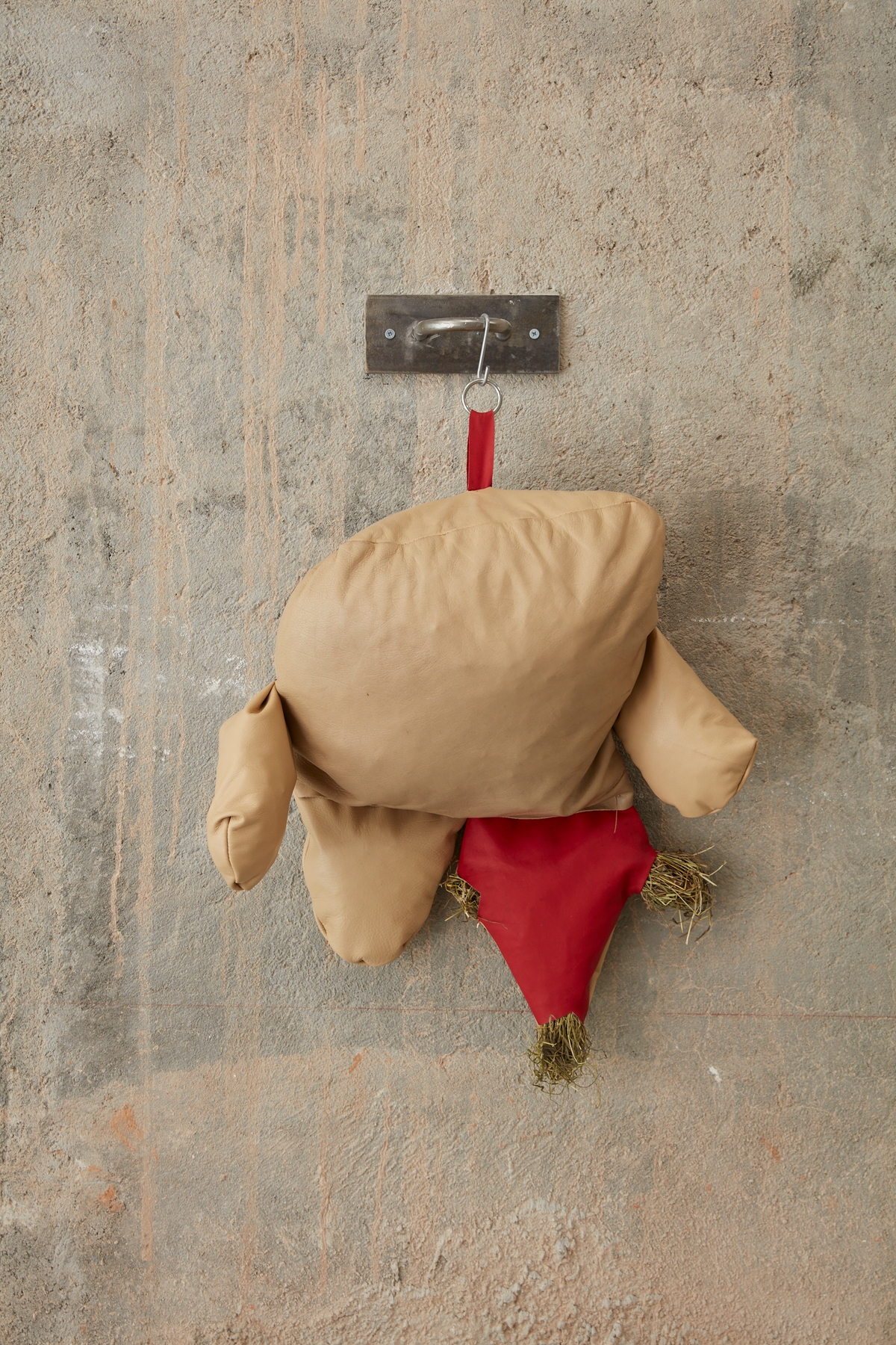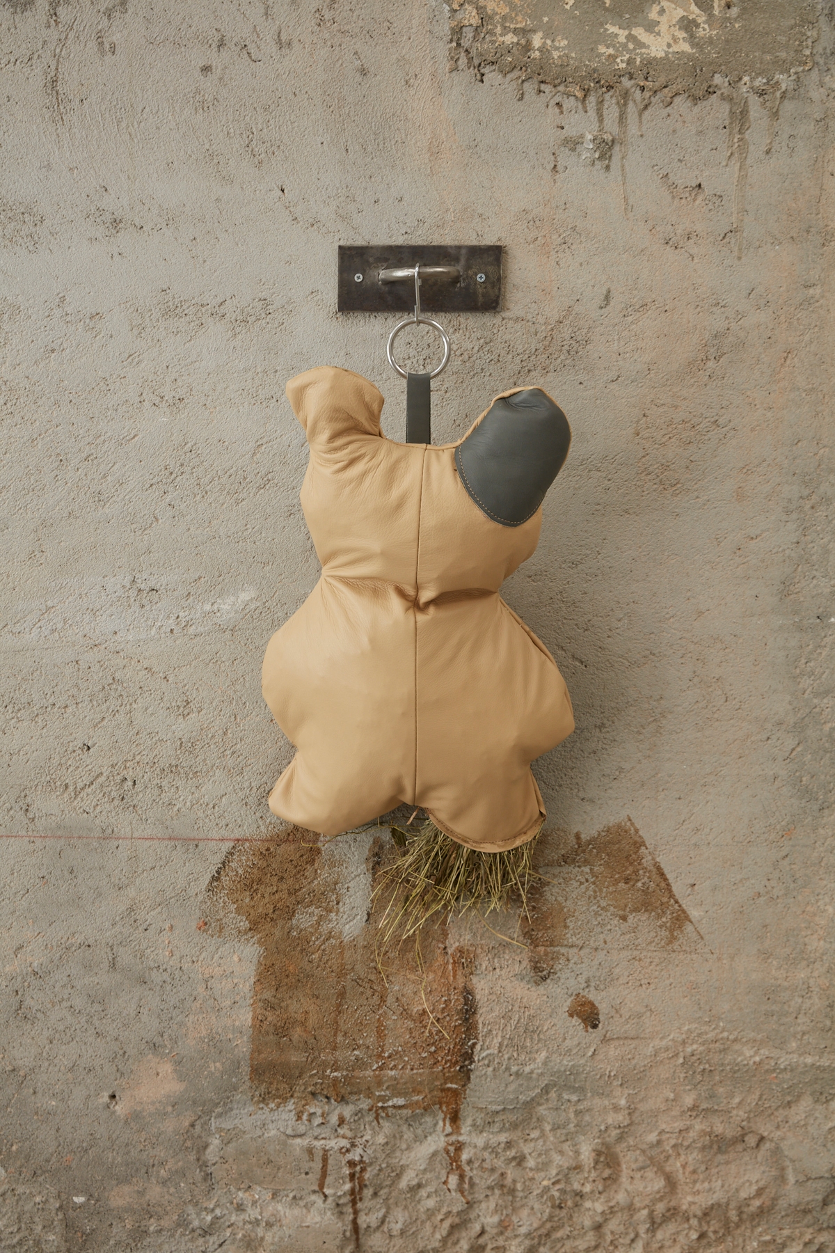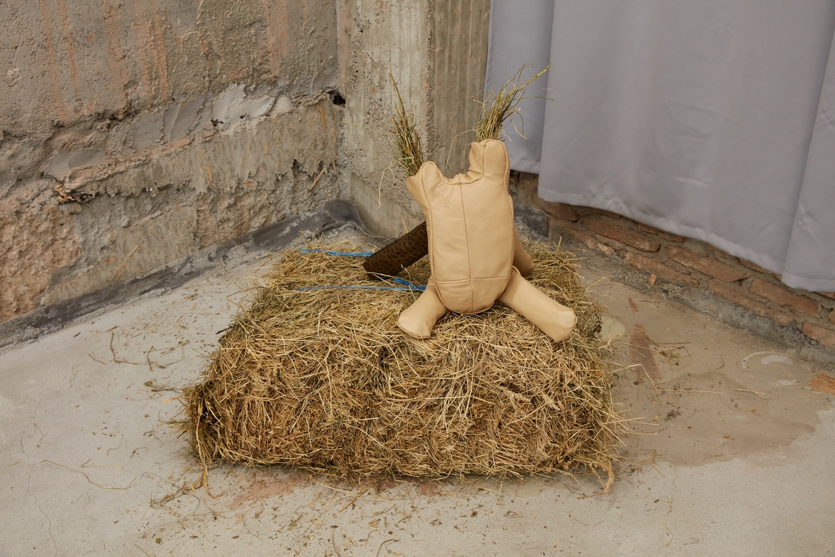 Recycled leather, hay, metal fixtures. Dimensions variable.