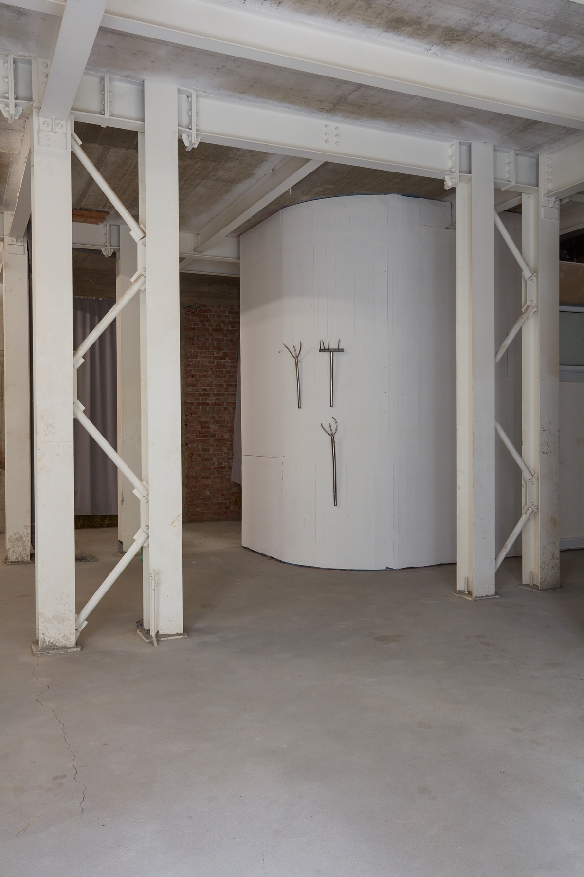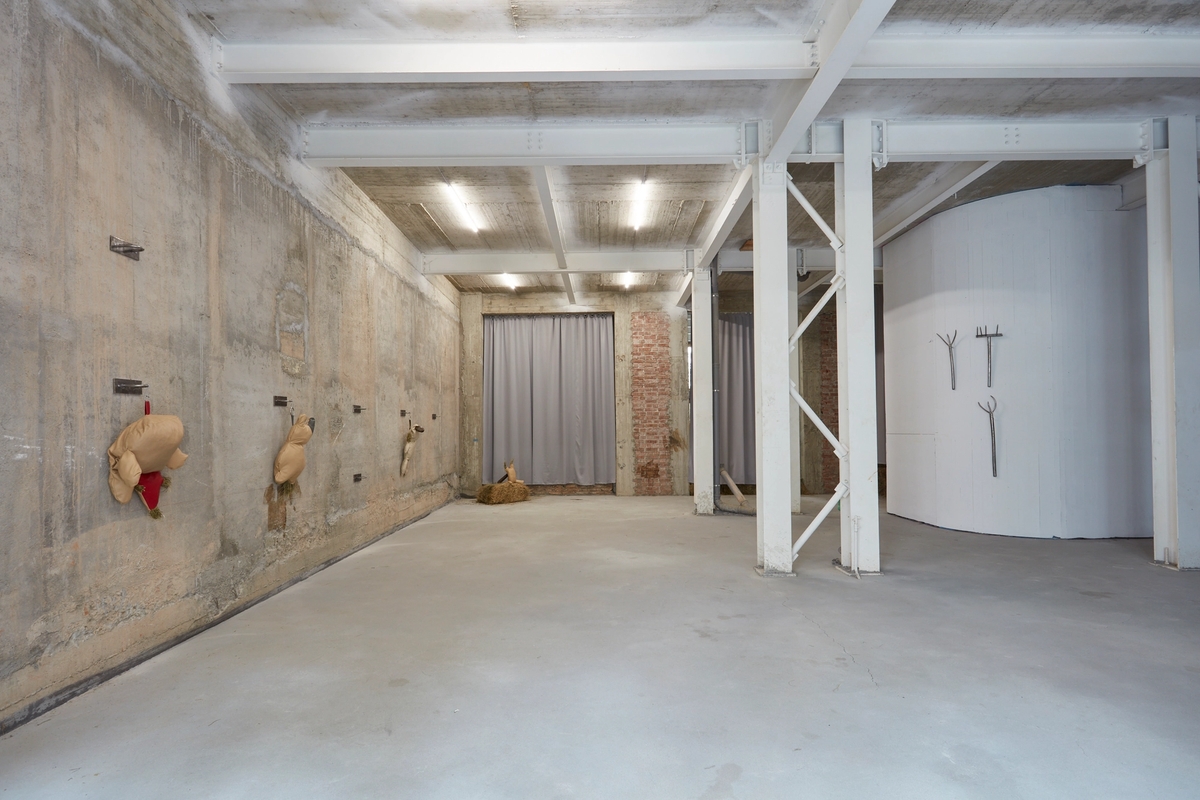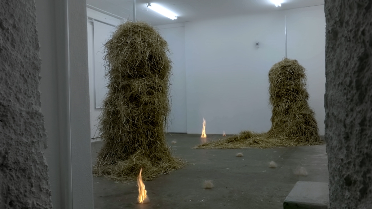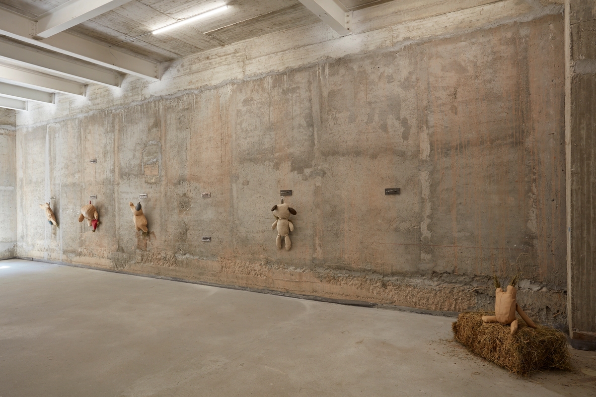 Recycled leather, hay, metal fixtures. Dimensions variable.