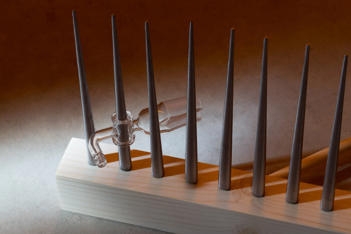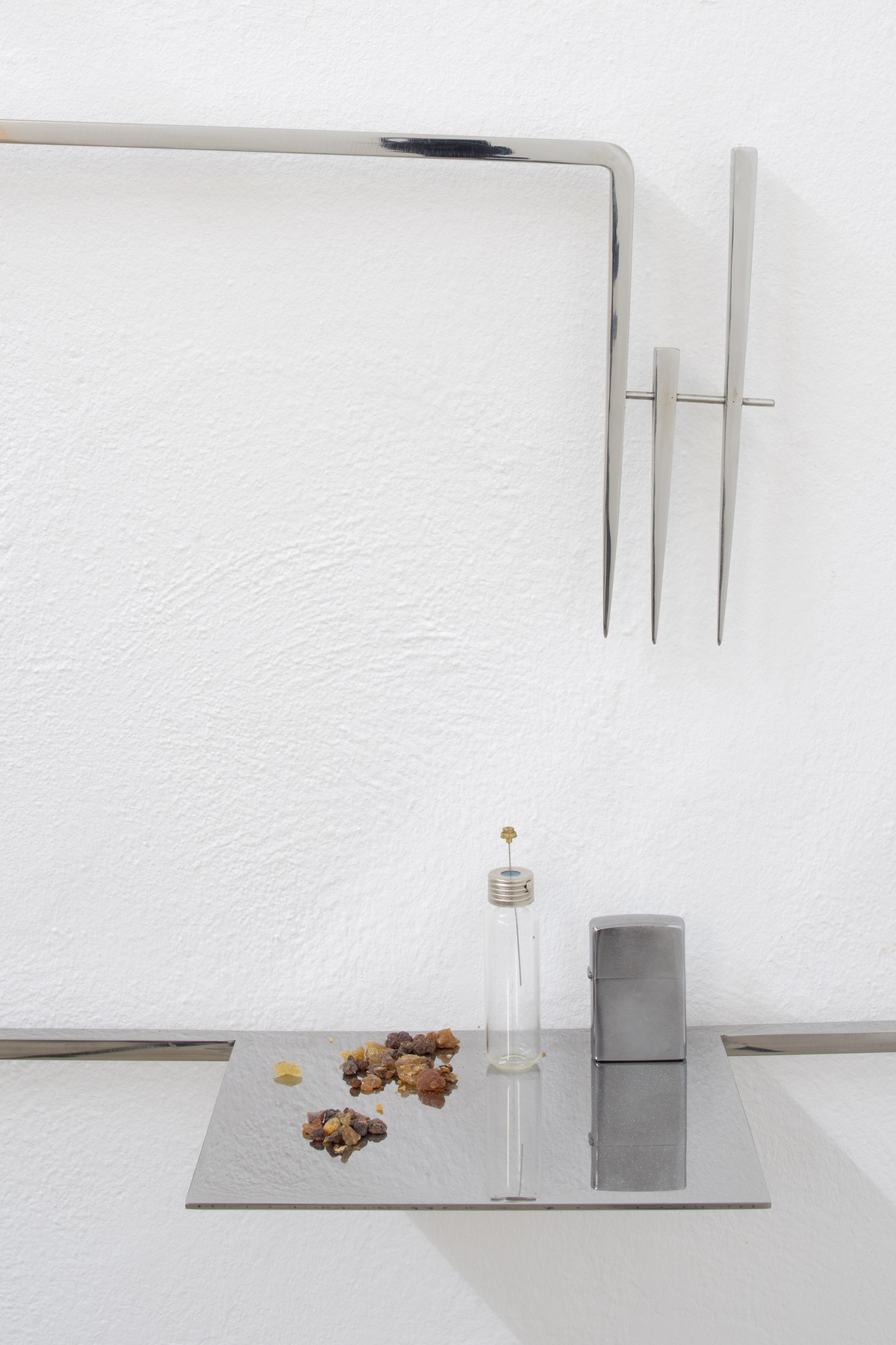 Polished stainless steel, myrrh, LED, sampling bottle, headspace needle, saliva, lighter