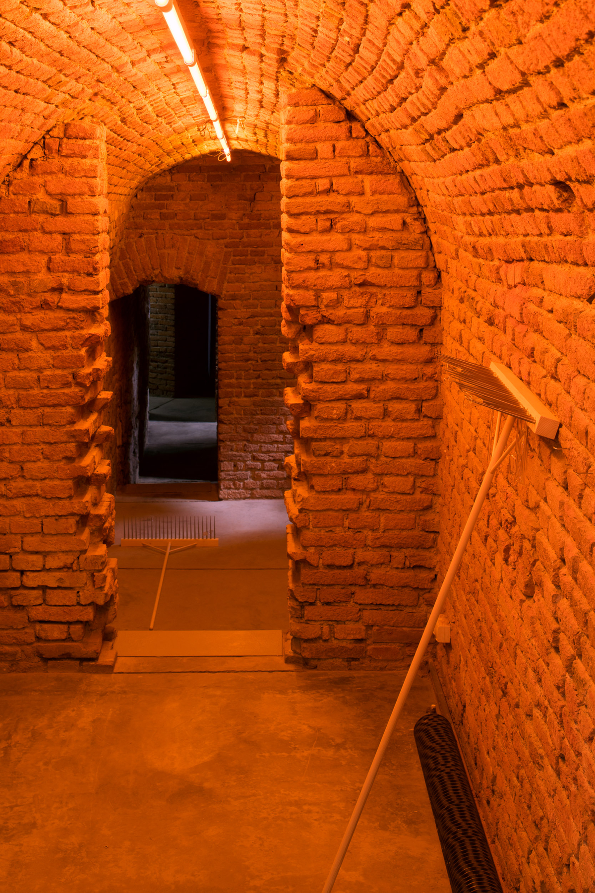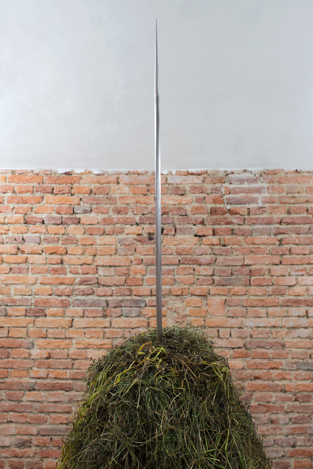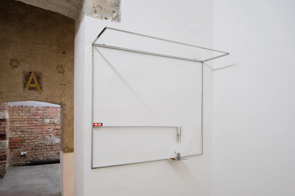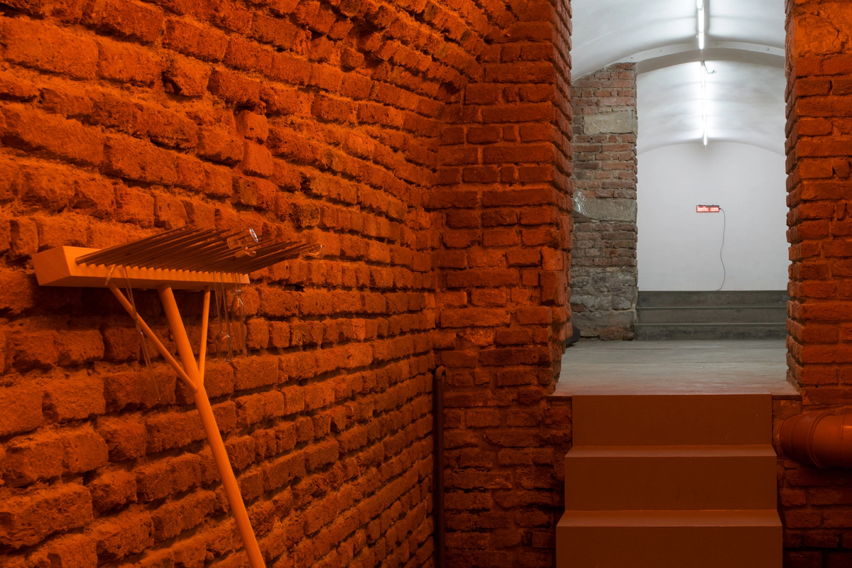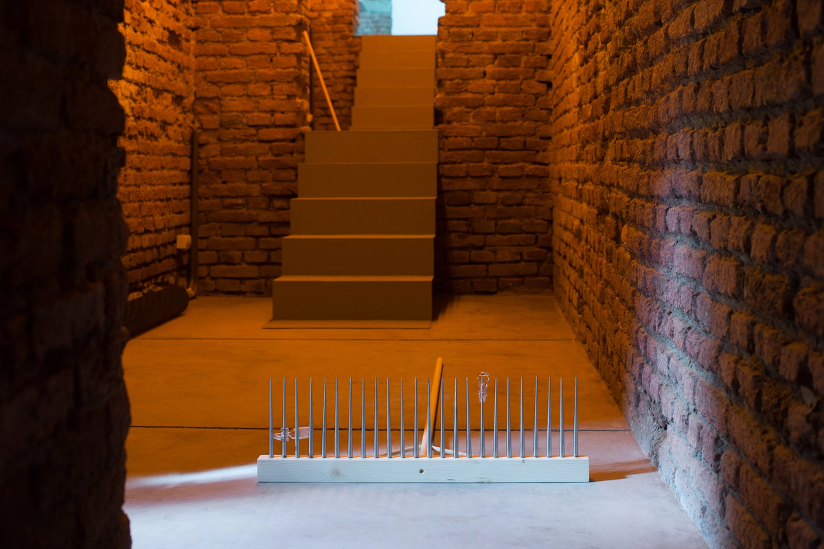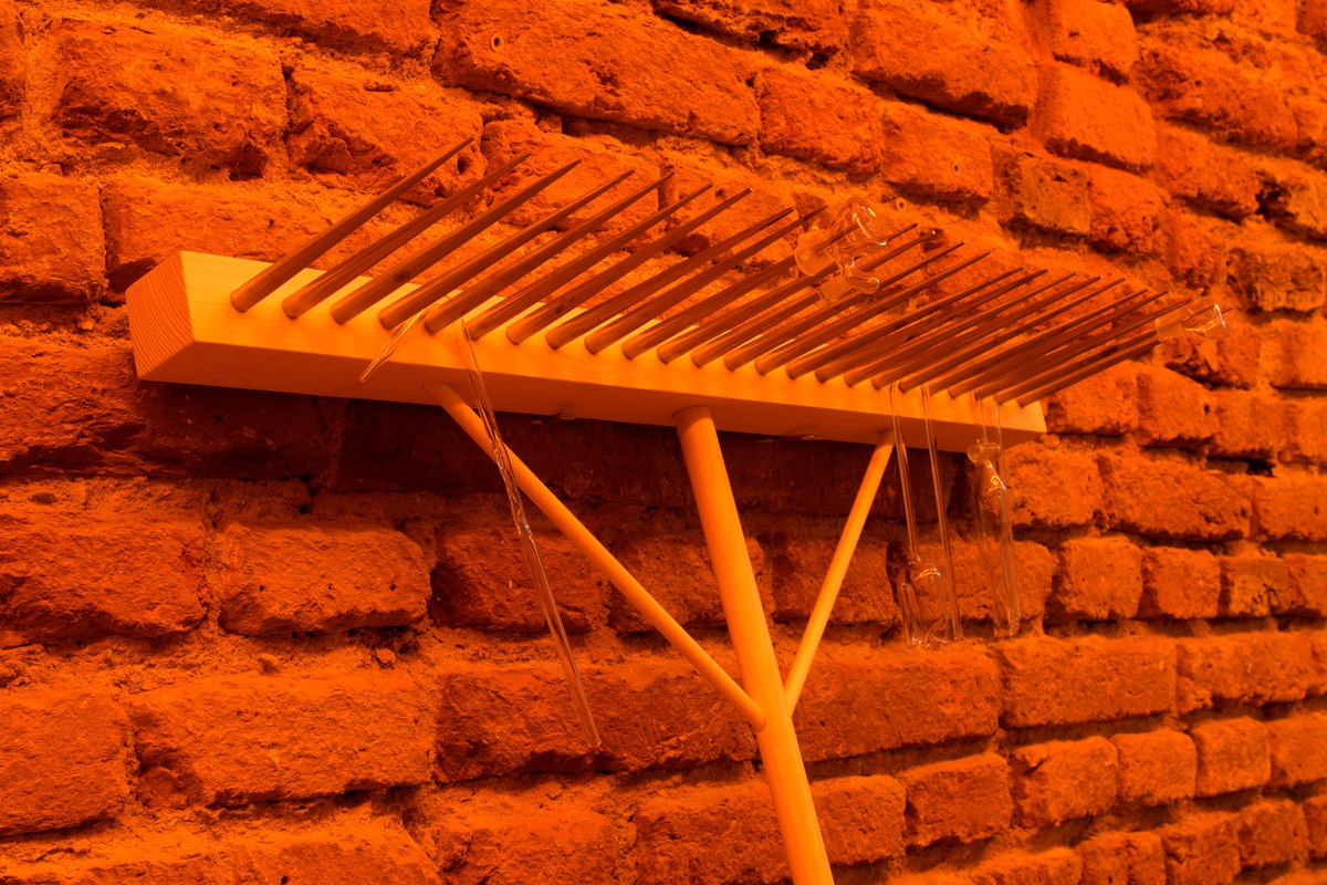 , 2019. Spruce wood, polished steel, deformed lab glass