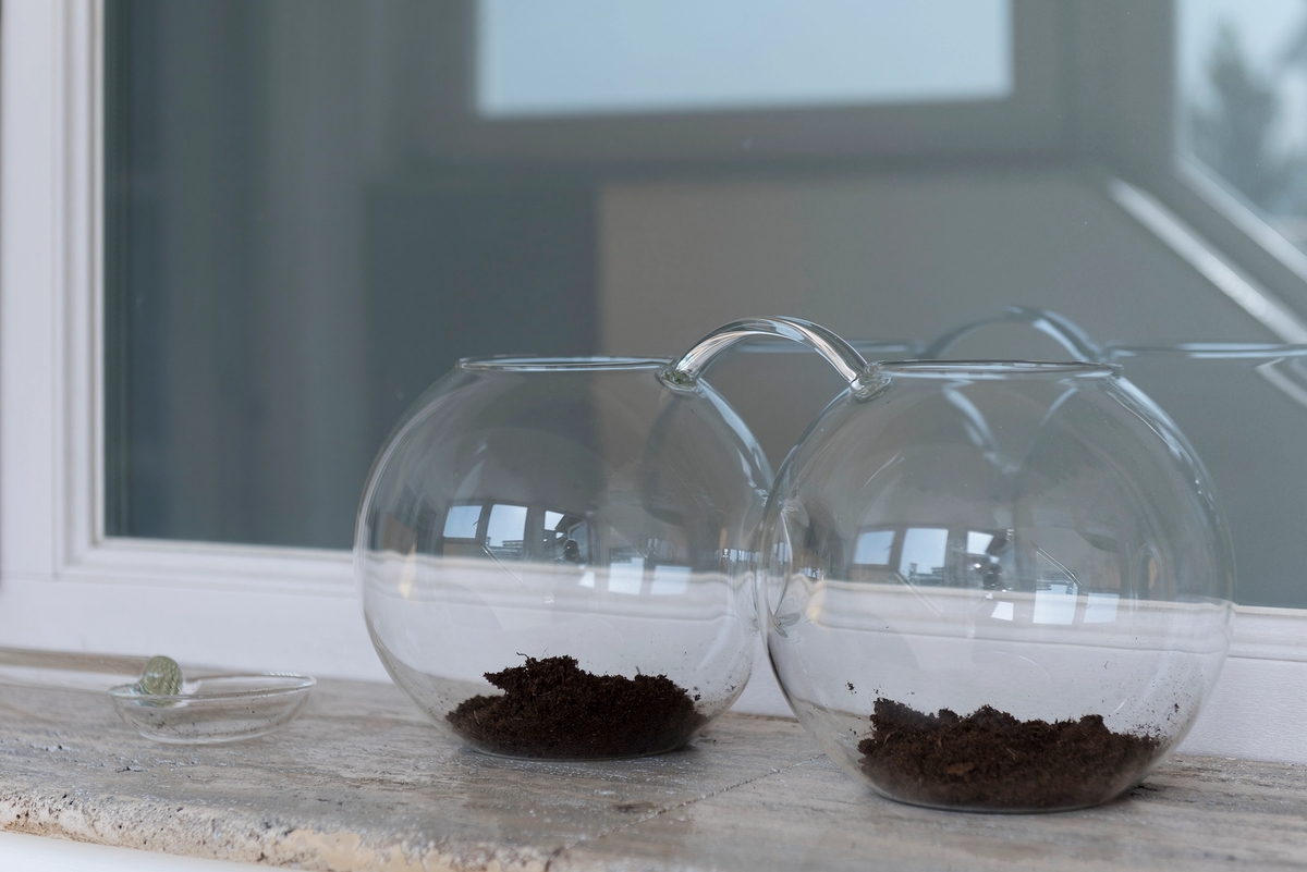 Dwojaki (I-II), 2020. Precision glass utensils, local soil. 40 x 40 x 20 cm.