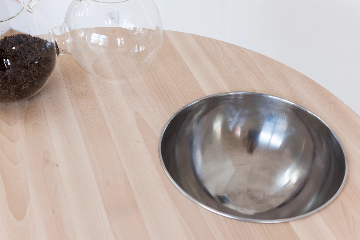 Leave no trace II, 2018. Polished stainless steel, myrrh, LED, sampling bottle, headspace needle, saliva, lighter; 140 x 120 x 40